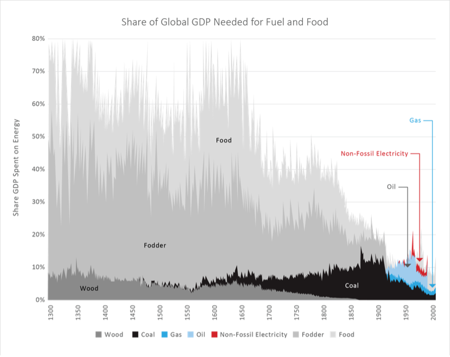 Perhaps the single most remarkable achievement of humanity over the centuries has been the reduction in the share of national economies devoted to simply getting enough food and fuel. For most of history, between 50% and 80% of the economic output of nations has been consumed by those two essential pursuits. Since the dawn of the industrial and fossil fuel era—which are closely interlinked—that share has dropped impressively to below 20%. (Figure 11) This is the real “energy transition”, and it has freed up time and capital for people to spend on education, health, comforts, and protecting the environment.