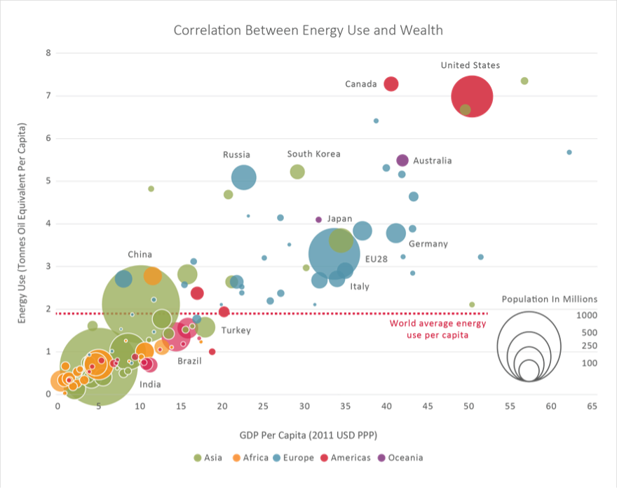 There is a very strong correlation, both historically and globally, between access to affordable, reliable energy, and the realisation of safety, comfort, convenience, and beauty—what we call human flourishing. Yet, globally, there is an enormous spread between the per capita energy consumption in developed nations compared with nations that are developing or yet still emerging. A minimum level of per capita energy use is required for what most would consider a decent quality of life. Some two-thirds of the global population live below that level.
