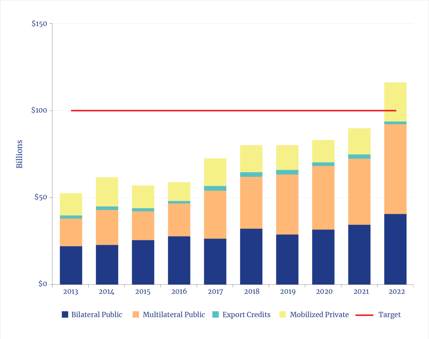 More modest climate finance targets—such as the commitment made at COP15 in Copenhagen in 2009 by rich countries to provide $100 billion each year in climate finance to developing countries—have not been met. The OECD tracks four primary sources of climate finance under the umbrella of that $100 billion initiative, and for the period 2013–21, the cumulative shortfall was $265 billion. Only in 2022 (the latest data available) was the target exceeded (see Figure 4). However, according to Oxfam, the British aid charity, even this apparent modest success is not what it seems.11 Oxfam reports that of the $116 billion pledged in 2022 (the last year for which OECD data are available), $92 billion was public finance, of which 70% was in the form of loans at market interest rates, not grants.