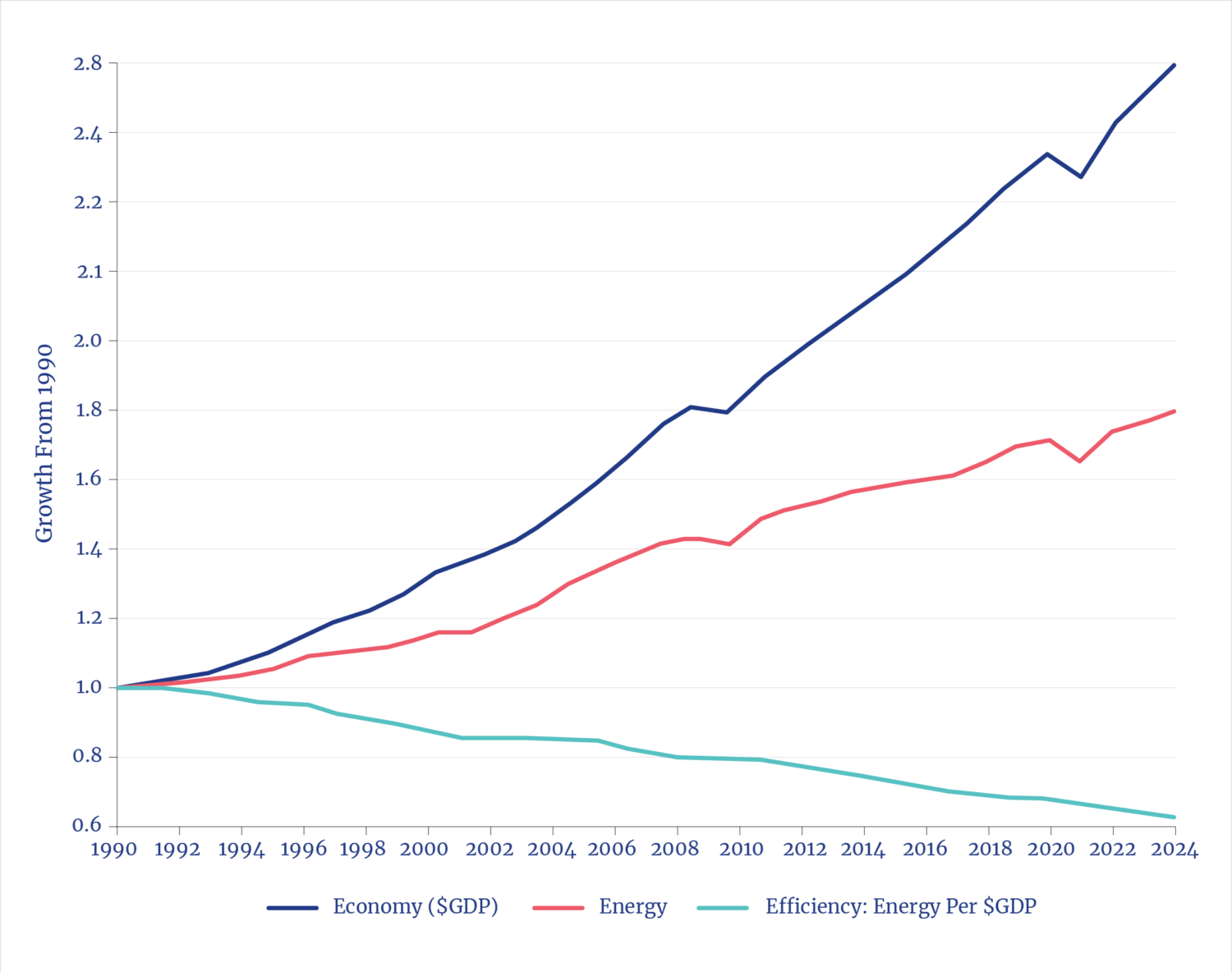 Regarding long-run efficiency trends of devices and machines, the WEO reflects well-established views that there are “improvements in the technical efficiency of energy use, via more efficient processes or equipment” (p. 26). In a static economy, that would arithmetically result in lowered energy use. However, as is widely known, the overall long-run reality is that foundational efficiency gains drive net growth in overall demand— the so-called Jevon’s Paradox. There is no evidence that this multi-century trend has changed in recent decades (see Figure 5).