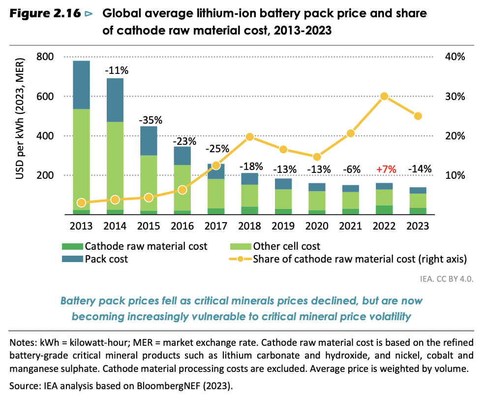 The WEO hedges its rhetoric but not its models, observing that[2]lower [mineral] prices have helped to bring about lower clean technology costs, including a 14% reduction in battery pack costs in 2023 but they are now dampening the investment appetite for new resource developments, with implications for future supply diversification (BNEF, 2023). In the case of nickel, for example, three-quarters of operating or potential projects that are at risk in today’s price environment are outside the top-three producing countries. If they close because of low prices, supply will become further concentrated among the largest suppliers. (p. 216; emphases added)