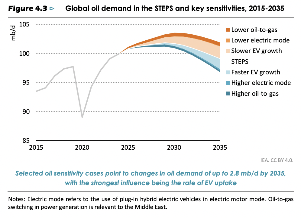 No economist or policymaker should believe that he can predict the actual future economic growth rate. But for planning purposes, it is crucial to understand the consequences of a higher growth rate, not least because the pursuit of prosperity remains a central goal of (most) governments and because annual GDP global growth rates have frequently been a half-percentage point higher than the WEO models (see Figure 2). The WEO’s 2.7% annual growth rate is lower than the 3.2% average rate from 2010 to 2023. A scenario assuming, say, the same 3.2% annual growth rate—and a BAU relationship between GDP and oil—would lead to global oil demand in 2035 some 10 mmbd of oil greater than today. That difference is equal to adding another entire Europe Union to global oil demand.