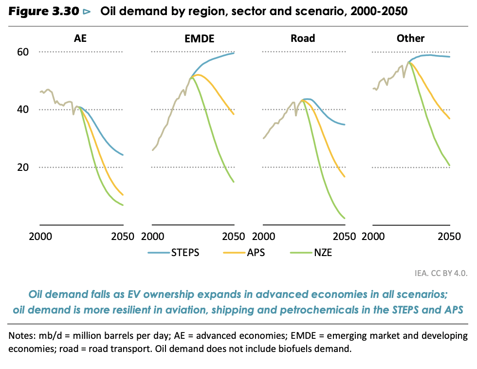 There is an inherent tension in the WEO scenarios regarding the future price and availability of oil. On the one hand, scenarios that see oil in excess supply while demand declines point to lower prices, which, in turn, amplify the cost penalties of avoiding oil use. On the other hand, if scenarios see constrained supply with sustained or higher demand, that self-evidently drives prices up and creates economic headwinds, including broad-based inflation. The latter occurs regardless of scenarios since, in the time frames considered, oil continues to have a dominant role in supply chains and transportation across all energy sectors including, and especially, the energy-intensive mining and minerals domains. Without considering a full range of realistic scenarios for future oil supply, there is little credibility for the WEO conclusion that “oil prices in our scenarios act as intermediaries to balance global supply and demand, ensuring markets remain in equilibrium” (p. 90; emphasis added).