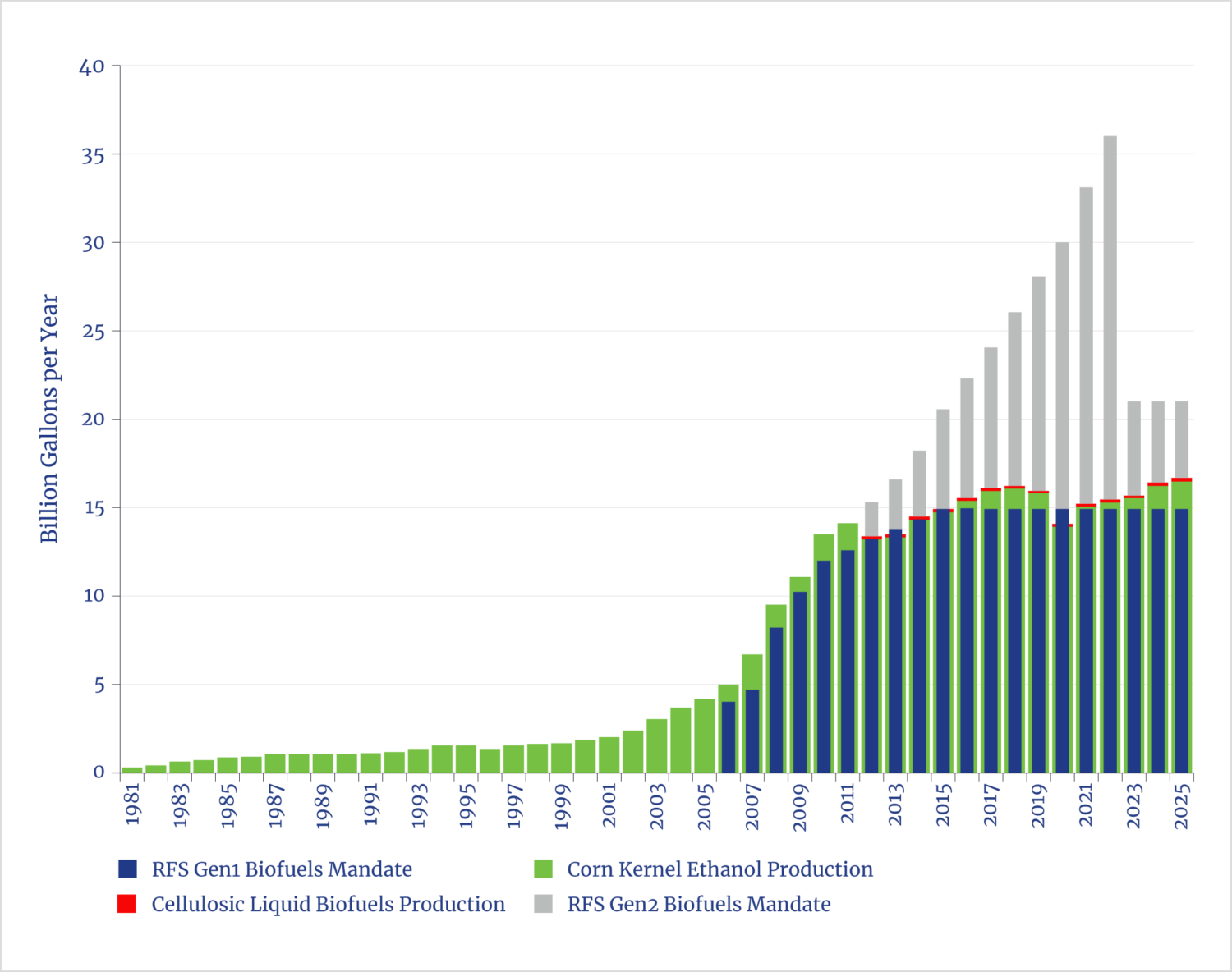 The green bars show total annual gallons of corn ethanol produced from the starch in the food kernel portion of the plant at the nation’s nearly 200 biorefineries.iv The graph illustrates approximately linear growth from virtually zero to 4 billion gallons per year in the 25 years from 1981 through 2005, followed by a quick tripling of production during a decade of exponential growth and then a plateau that has endured since 2015. Virtually all first-generation biofuel in the United States is corn starch ethanol. By 2022, Congress anticipated in its statutory RFS quotas that advanced biofuel production—mostly from cellulosic ethanol—would reach 21 billion gallons per year, eclipsing conventional corn starch ethanol production. However, at this graph’s scale, the red bars of actual cellulosic ethanol production that fill in the bottom of the gray quota bars are so small as to be essentially invisible—amounting in 2025 to only 0.5% of the volume of corn starch ethanol.v
