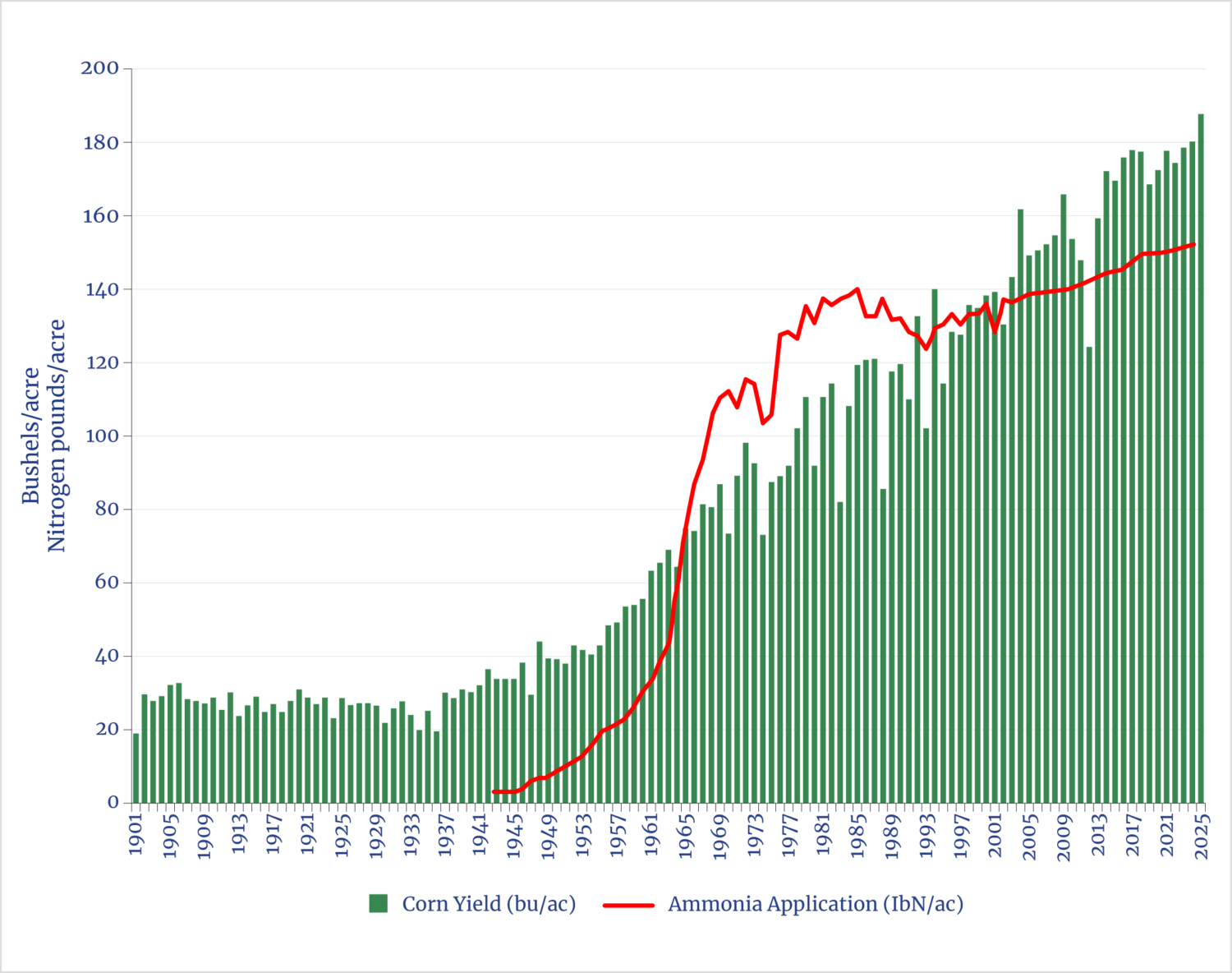 U.S. Department of Agriculture historical data show that corn yields never exceeded 32 bushels per acre from the American Civil War through 1942—despite active farming innovations including crop rotation, hybridization, and mineral nitrogen fertilizer application. Yields skyrocketed, however, when farmers accessed surplus ammonium nitrate from giant synthetic ammonia plants built by the U.S. in the early 1940s for wartime explosives.xxxvi All U.S. ammonia today derives from natural gas, and virtually all of it ends up as fertilizer on crops. Nitrogen as ammonia is now applied to grain corn at a nationwide average of 152 pounds per acre, and that rate is still increasing.xxxvii This fertilization has enabled much of the sixfold increase in yield since 1940 (see figure 11).