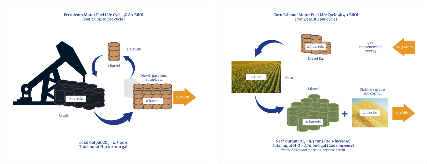 To illustrate the cost of pursuing low-EROI energy sources, figure 12 shows a comparison that generously grants corn ethanol the industry’s aspirational 4:1 EROI against a very conservative 8:1 EROI for refined petroleum. Both cycles are normalized to produce the same net energy of 43 million British thermal units (MBtu), which is equivalent to eight barrels of diesel fuel.