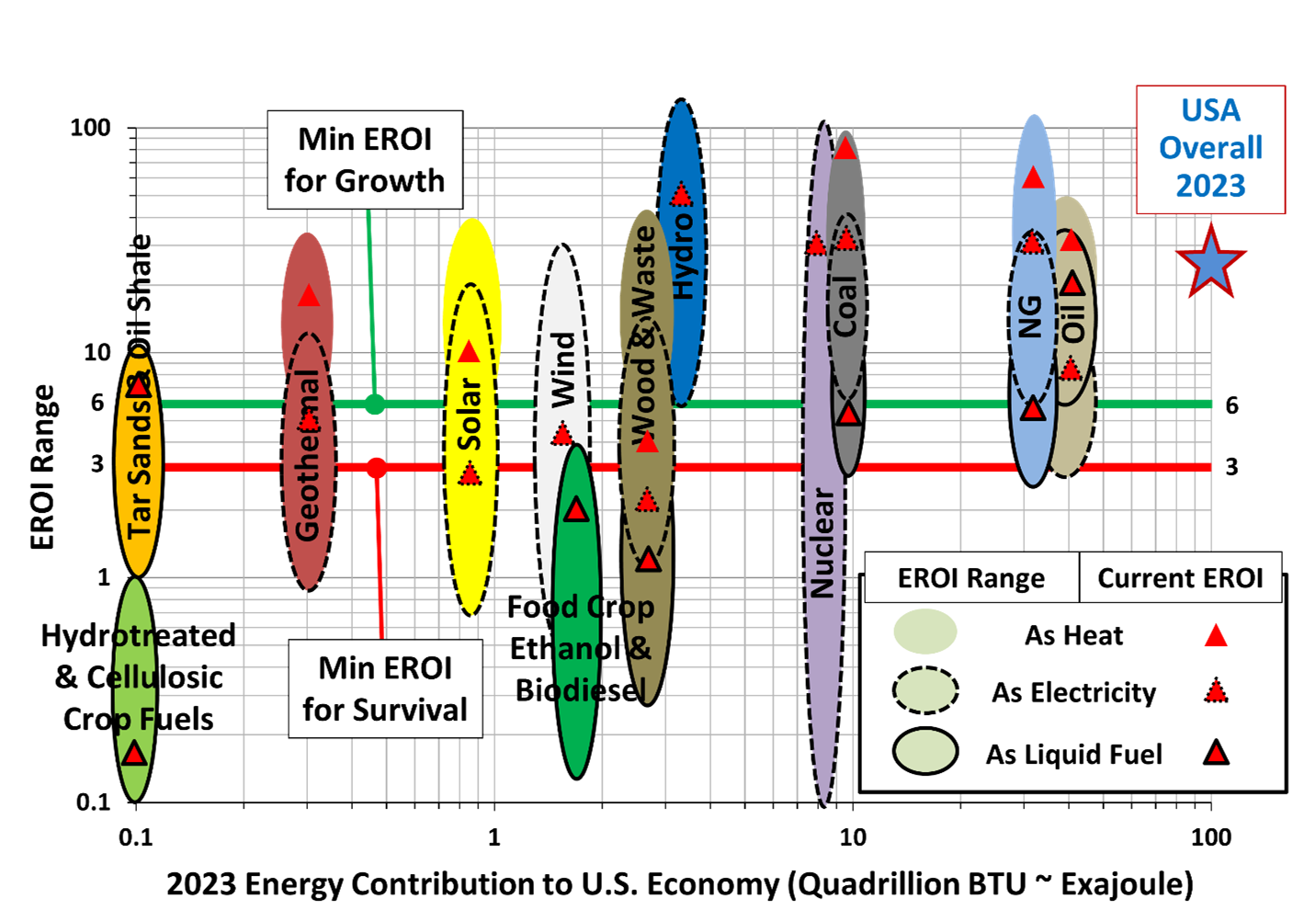 - Kiefer, Twenty-First Century Snake Oil, 16; with updates incorporated from Louis Delannoy et al., “Emerging Consensus on Net Energy Paves the Way for Improved Integrated Assessment Modeling,” Energy & Environmental Science 17, no. 1 (2024): 11–26; D. Weißbach et al., “Energy Intensities, EROIs (Energy Returned on Invested), and Energy Payback Times of Electricity Generating Power Plants,” Energy 52 (April 2013): 210–21; Charles A. S. Hall et al., “EROI of Different Fuels and the Implications for Society,” Energy Policy 64 (January 2014): 141–52; and Lawrence Livermore National Laboratory, “Estimated U.S. Energy Consumption in 2023: 93.6 Quads” (Lawrence Livermore National Library and DOE, 2024).