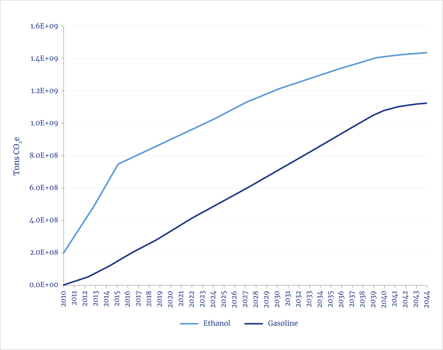 Today, this surge continues at a stabilized production rate 25 times higher than previous peaks, but its principal rationale has changed. Geological and geopolitical paradigms that once made petroleum seem scarce have been upended by an intervening revolution in technology that has put vast new hydrocarbon formations economically within reach. The United States, in the vanguard of this revolution, has rapidly become the world’s largest producer of mined hydrocarbons and a net exporter of more than 40 billion gallons of petroleum per year, mostly as refined gasoline and diesel fuel.xiv The political task for biofuels has shifted from replacing scarce, imported fossil fuels to displacing abundant, domestically produced fossil fuels. Meanwhile, in an ironic twist, the nation has been experiencing “peak ethanol” for a decade, with its production tracing the classic S-curve (logistics curve) of plateaued growth.