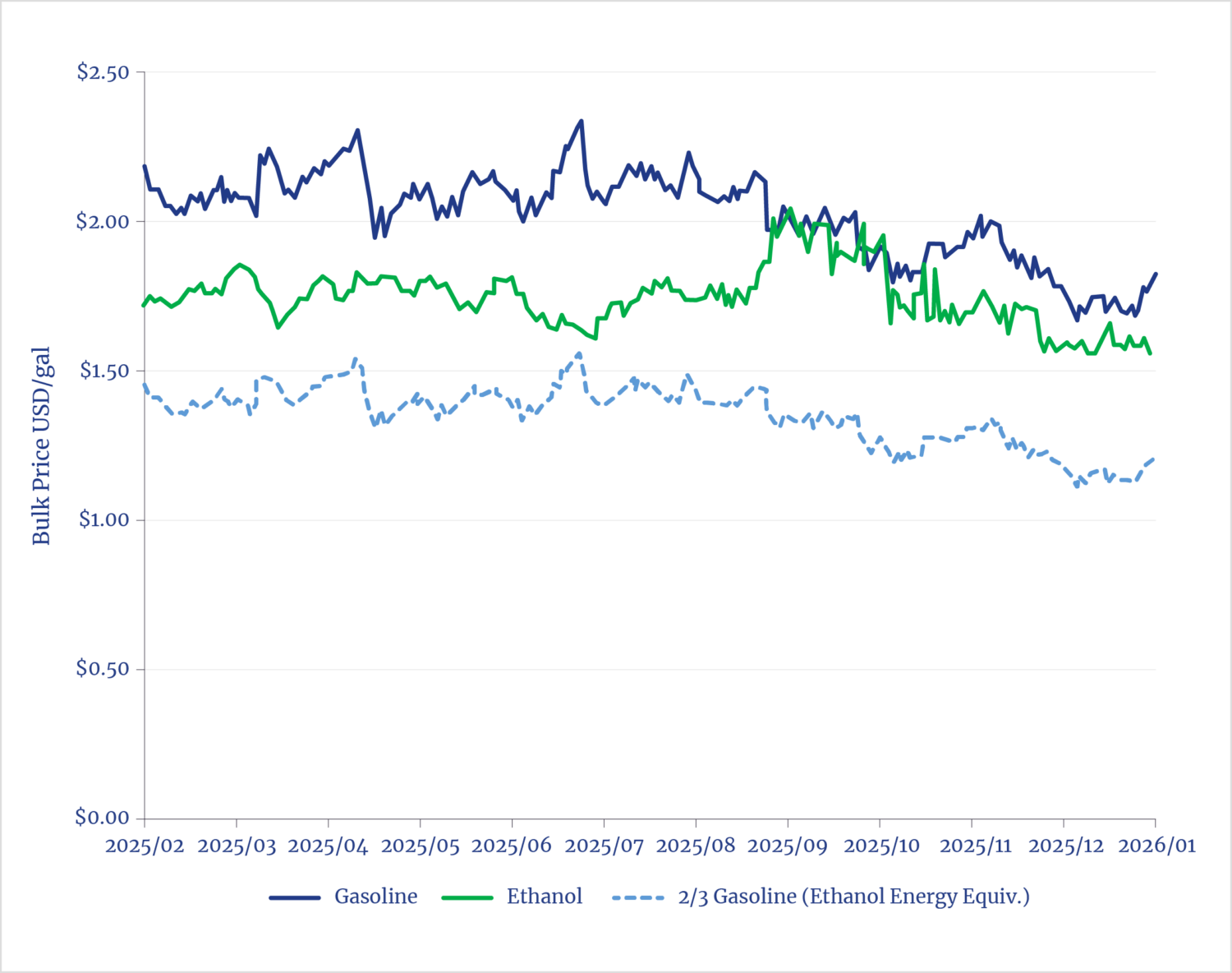 - See “International: Petroleum and Other Liquids,” U.S. Energy Information Administration (EIA), accessed February 2, 2026, https://www.eia.gov/international/data/world/petroleum-and-other-liquids/annual-refined-petroleum-products-consumption; and “Annual Ethanol Production: U.S. and World Ethanol Production,” Renewable Fuels Association, accessed February 2, 2026, https://ethanolrfa.org/markets-and-statistics/annual-ethanol-production. In 2024, global motor gasoline consumption was 419 billion gallons, while global ethanol production amounted to 31.31 billion gallons.