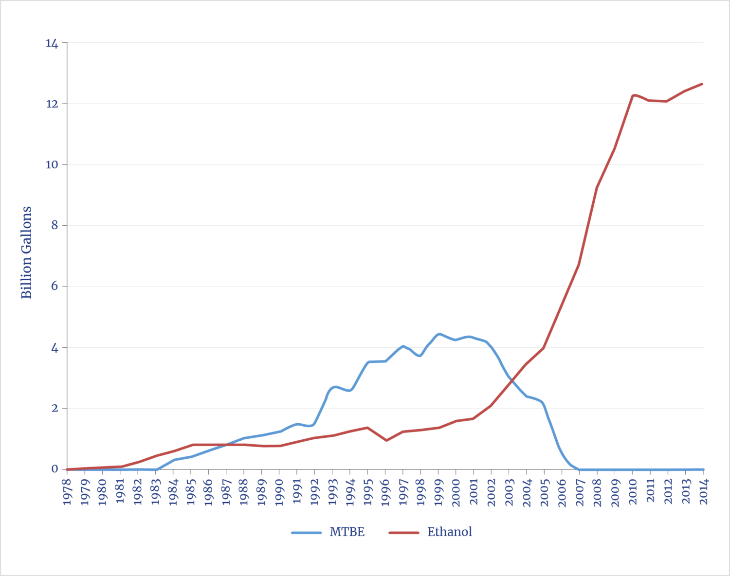The early 2000s inflection point in the figure—where conventional corn ethanol production starts its brief exponential rise—coincided with a triple-punch of congressional legislation and EPA rulemaking that favored ethanol’s use for gasoline octane boosting, oxygenation, and biofuel blending. The close correspondence between the curves of RFS consumption mandates (shown in blue) and corn ethanol production (in green) illustrates that this federal mandate has had more economic power over ethanol production than anything that preceded it. However, the fact that RFS also appears to be unintentionally operating as a cap on corn ethanol production reveals that ethanol has not yet become competitive without government subsidy. The conspicuous deficit of cellulosic ethanol, despite decades of strong federal financial support and aggressive demand mandates, strongly suggests that something more than economic inertia and technological immaturity is holding it back.