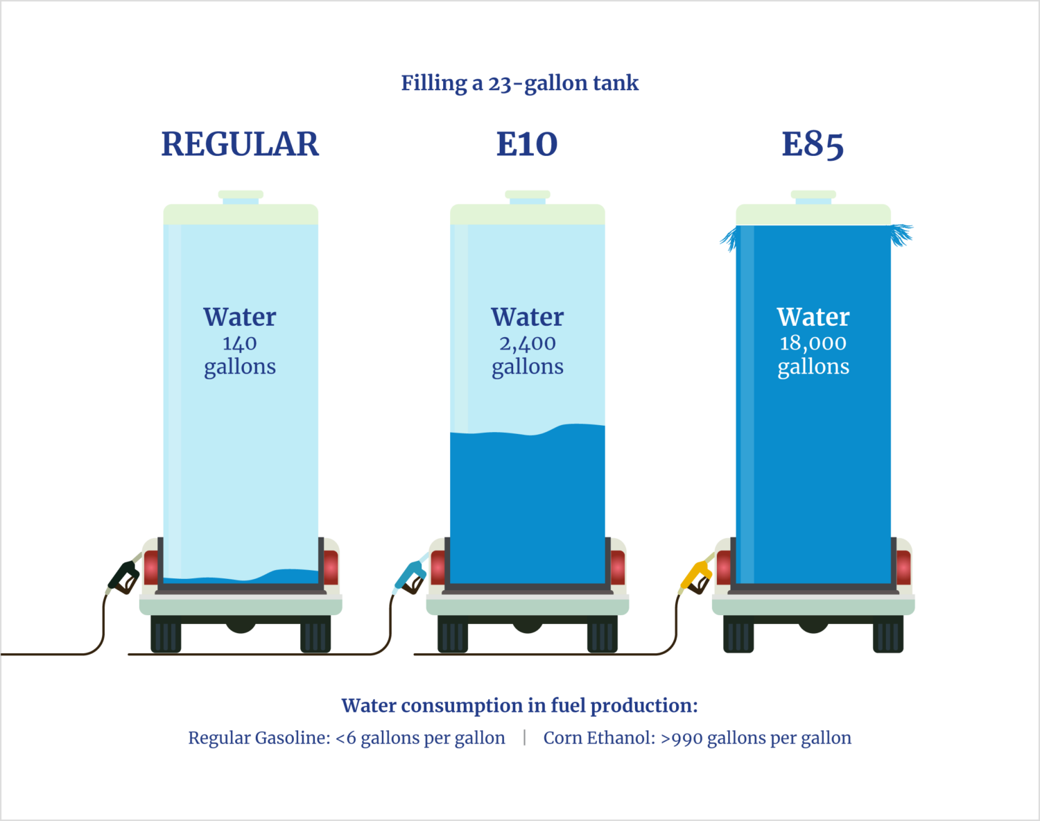 America’s agricultural-industrial complex is the top consumer of the nation’s scarce freshwater resources. It uses 992 gallons of water in producing a single gallon of corn ethanol, which is orders of magnitude higher than the 5.6 gallons per gallon required to produce gasoline. Blending 10% ethanol to make E10 gasoline increases water consumption by a factor of 18, and the E85 fuel blend requires 174 times more freshwater per mile driven than gasoline does.