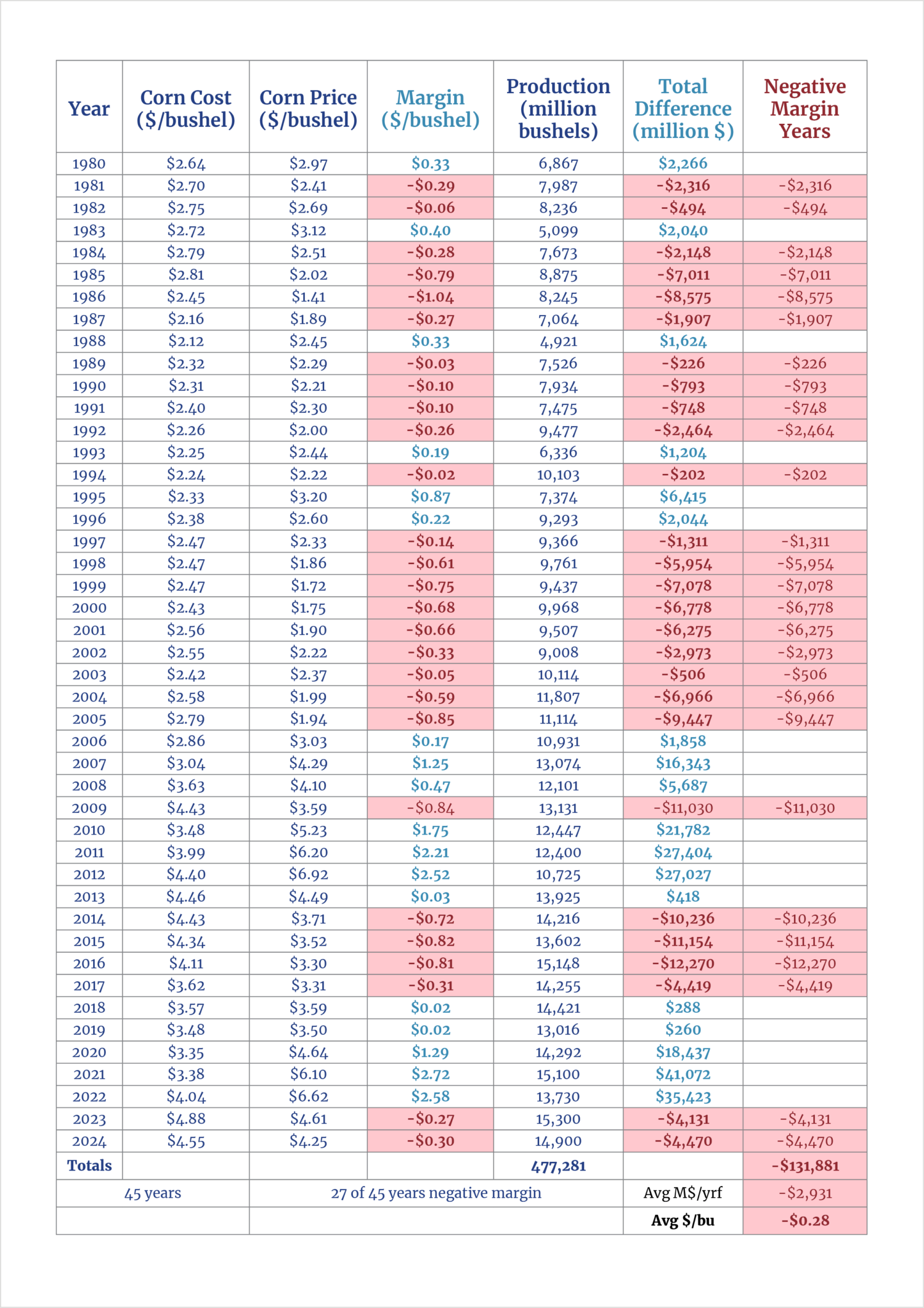 - Ann Johanns and Chad Hart, Historical Costs of Crop Production, Ag Decision Maker File A1-21 (Iowa State University Extension and Outreach, 2025), 2; and Ann Johanns, Cash Corn and Soybean Prices (USDA NASS), Ag Decision Maker File A2-11 (Iowa State University Extension and Outreach, 2026), 2. Iowa corn cost and price statistics were used as proxy for all states.
