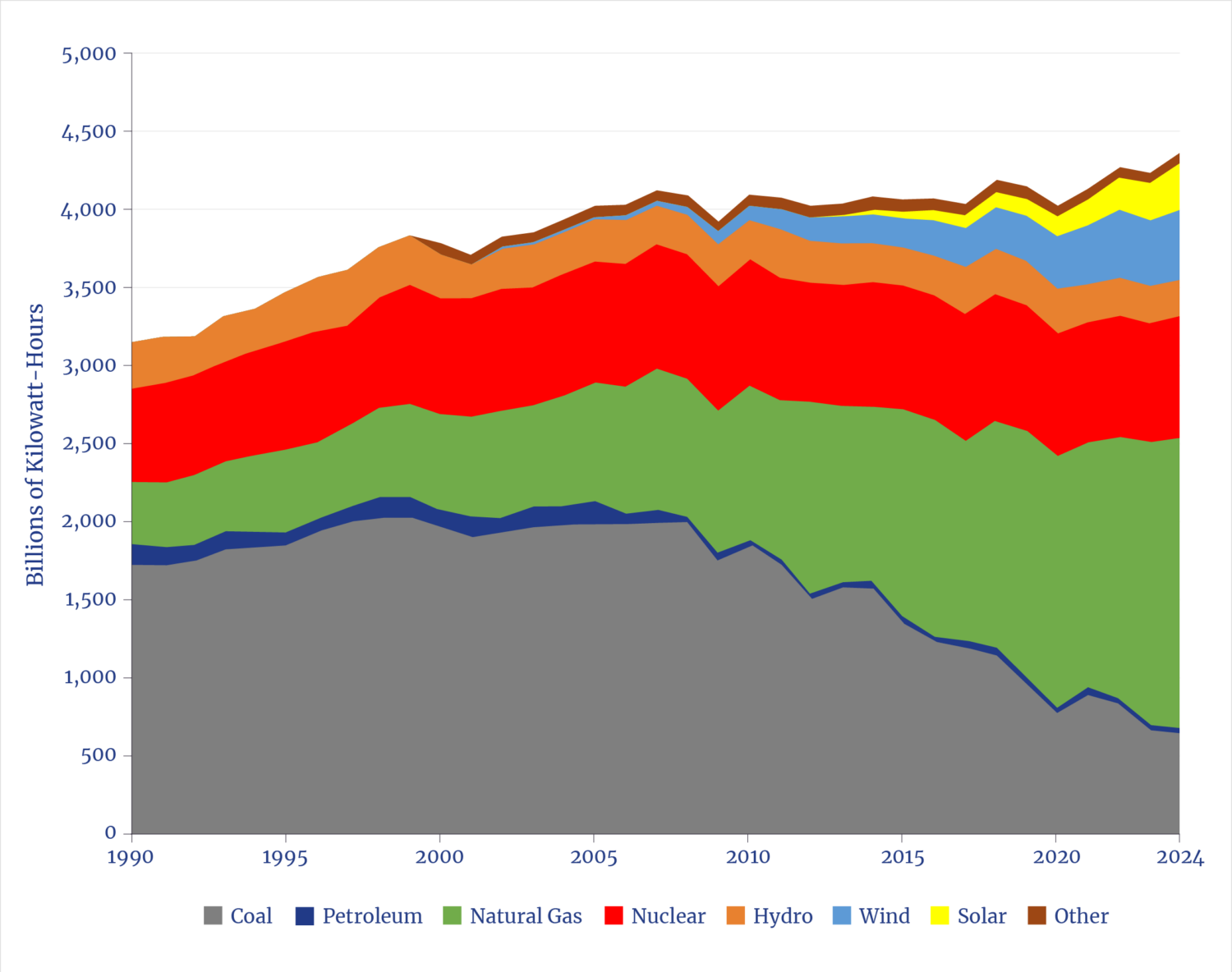 Figure 2: U.S. Electricity Production by Source, 1990–2024