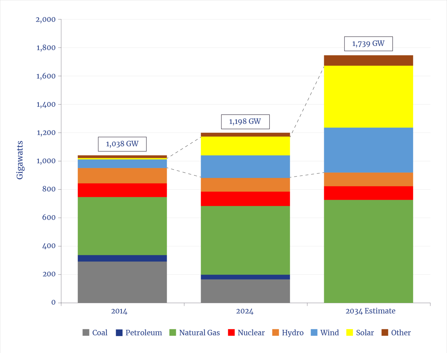 between 2024 and 2034 (541 gigawatts, an increase of 45%) will be driven by renewable sources such as wind and solar (augmented by temporary backup battery storage). Based on EIA’s latest long-term base-case forecast, natural gas is expected to fully displace coal within 10 years and account for 41.4% of U.S. generation capacity by 2034, with nuclear and hydroelectric capacity remaining static in nominal terms but declining sharply on a relative basis over the period. Wind and solar generation capacity are projected to increase from 22.9% in 2024 to 43.0% of the U.S. total in 2034.8