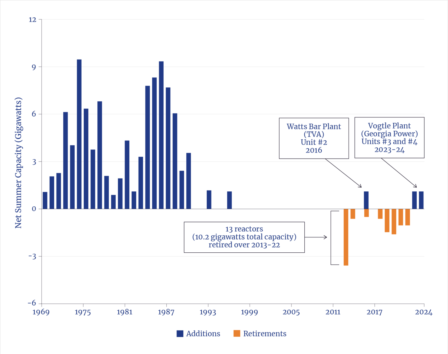 Figure 4: U.S. Nuclear Power Capacity Additions and Retirements, 1969–2024