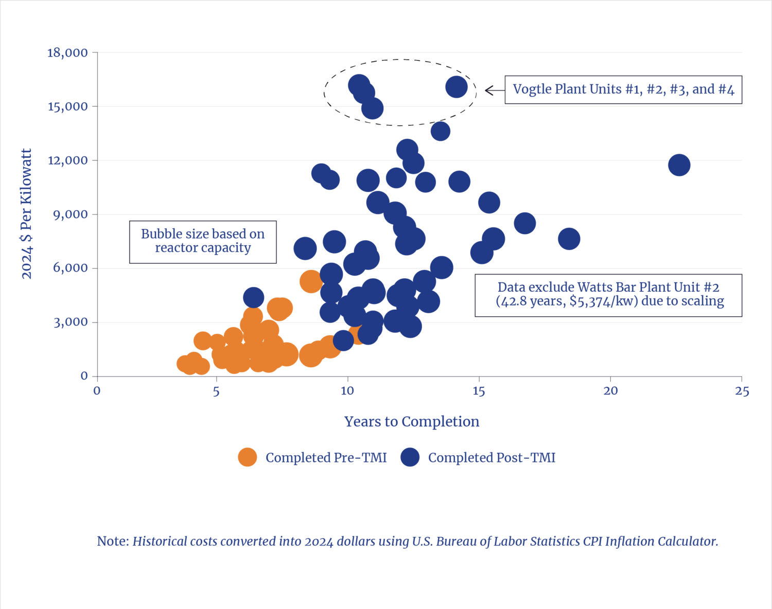 Even though U.S. consumer price inflation and general interest rates dropped sharply between the 1970s and the 1980s,39 the delivered cost for a new nuclear reactor more than doubled while taking twice as long to finish. During this period of arrested industry development, few synergies and cost savings were realized between the first and successive units added at most nuclear plant sites. As Figure 5 illustrates, the 43 reactors completed prior to 1979 took a median 6.0 years to complete, at an average cost of $1,897 per kilowatt in 2024 inflation-adjusted dollars. The 51 reactors completed since 1979 (including the three commissioned over 2016–24) took a median 12.2 years to complete, at an average capital cost of $7,627 per kilowatt. Differential reactor size does not explain this variance since the units completed pre-TMI