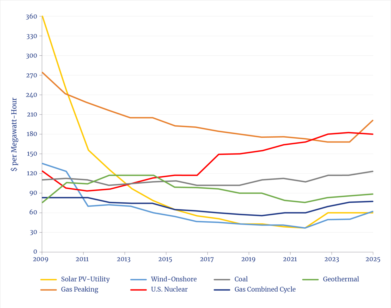 cheapest LCOE alternative at any point in time is not a sound way to ensure a stable, reliable, and low-cost grid, which depends, importantly, on a diversified pool of dispatchable fuels. This is the main argument that has been used to justify building more wind and solar generation capacity in recent years, despite the negative implications for overall electric grid reliability. Utility companies, regulators, and policymakers need to move past a myopic focus on current construction costs, which fluctuate and are only one piece of the puzzle when making longer term grid capacity decisions.