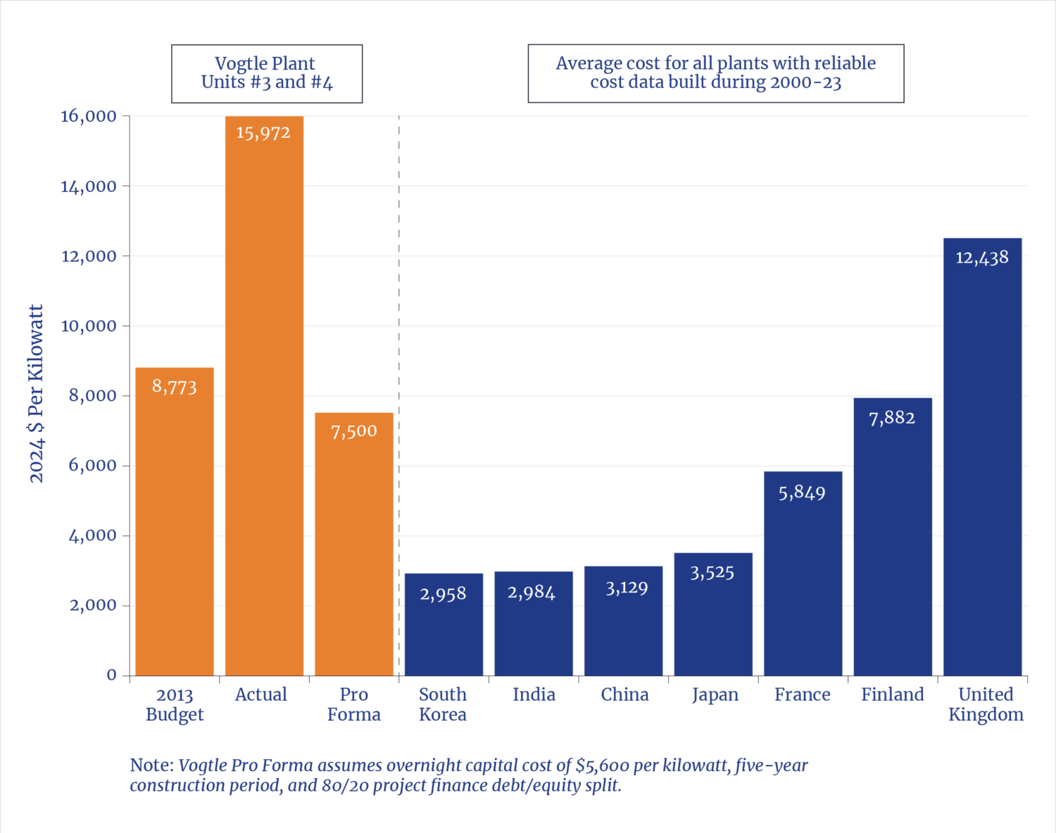 - Investor-owned U.S. electric utilities have had a poor track record of adding new reactor capacity on a timely and cost-effective basis because of persistent project cost overruns and construction delays. The last two large-scale U.S. reactors connected to the grid over 2023–24, Units #3 and #4 at Georgia Power Company’s Vogtle Plant, were the costliest to date. Even though much of that cost escalation came from several nonrecurring idiosyncratic factors that would not be applicable going forward, no utility company seems able to get past the Vogtle sticker shock and order a new large-scale nuclear power plant, including Georgia Power, which now has deep experience.
