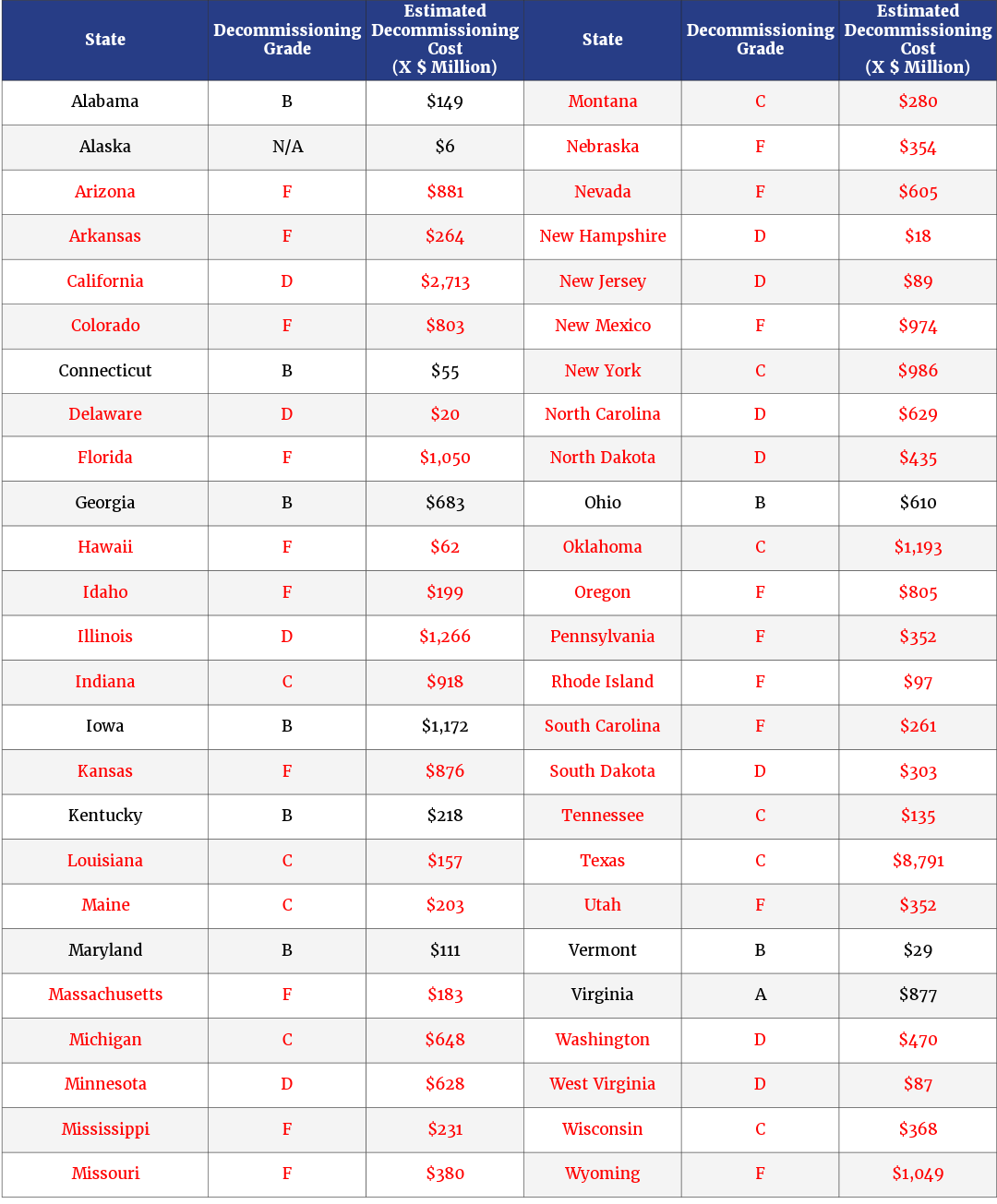 Meanwhile, when it comes to wind and solar decommissioning rules, there was just one A grade among the 49 relevant states. Only one-seventh of those states earned a B, with nearly two-thirds receiving a failing grade. This means that consumers or taxpayers—not the owners—will likely be left to pay a significant portion of the $50 billion or more in future decommissioning costs. (We think that the cost estimate, documented in the full report, understates those future expenses; this will be the subject of a future analysis.)