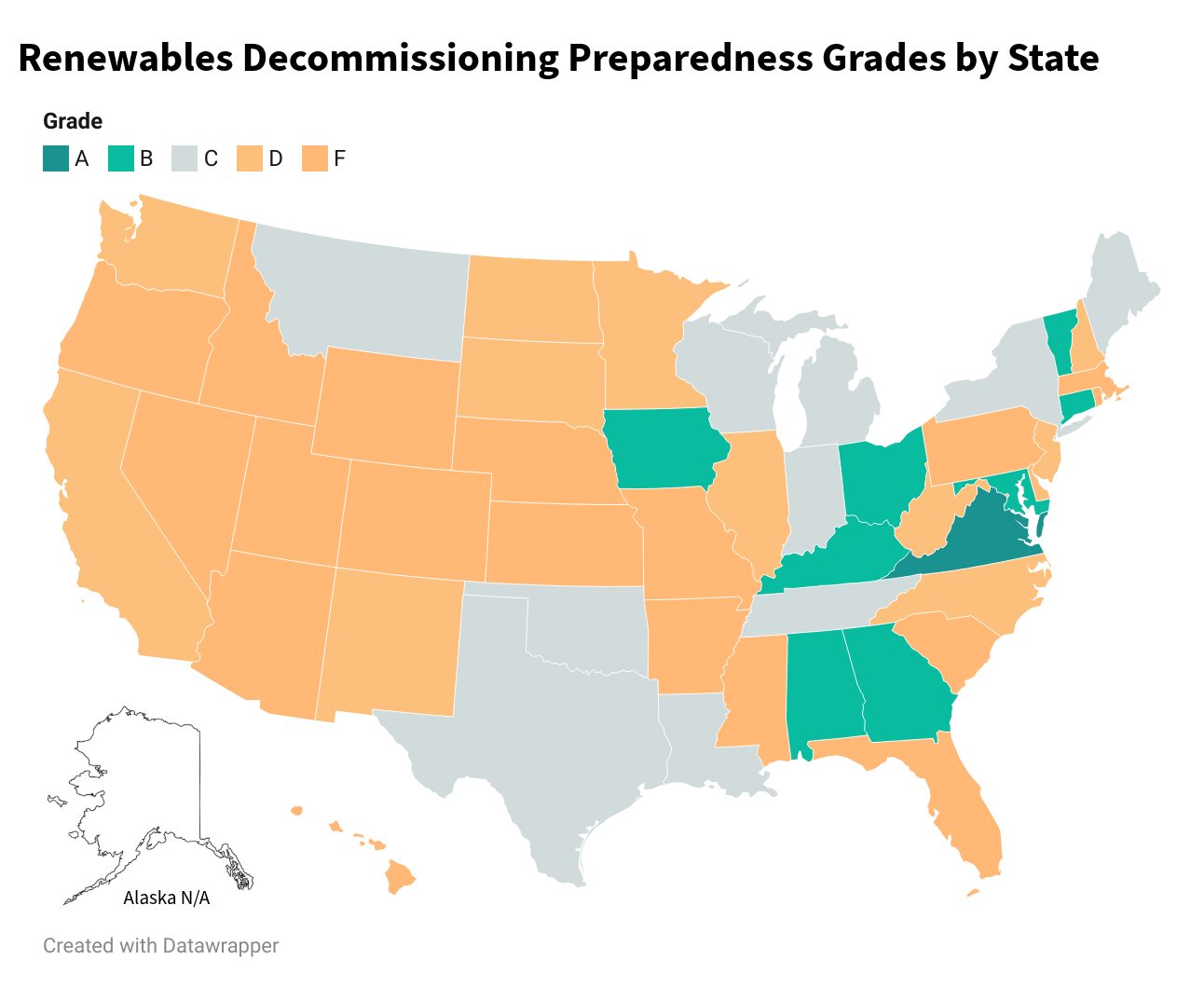To answer that question, we partnered with Curtis Schube, a lawyer and the executive director of the Council to Modernize Governance. Schube undertook a comprehensive, state-by-state review of the rules and regulations currently on the books for decommissioning wind and solar facilities. For comparison, we asked him to look at similar rules in each state for oil and gas wells, and we asked him to distill the results into a simple grading system from A to F for each state.