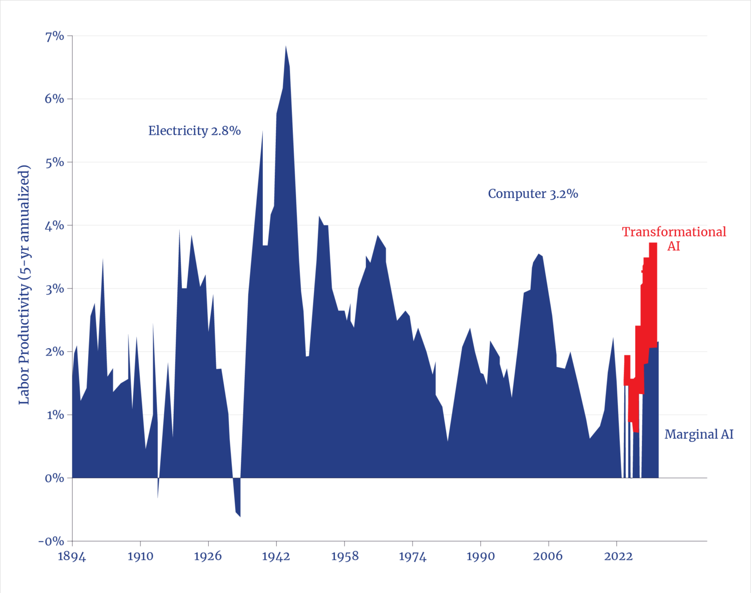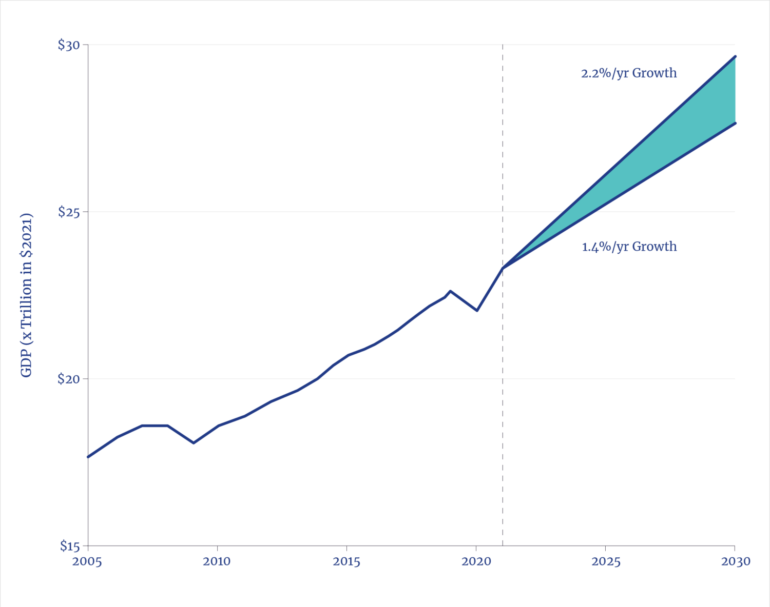 In its economic forecasts, the U.S. Congressional Budget Office assumes a 1.4% annual productivity growth rate for the next decade, a slight increase over the past decade’s anemic and historically low average of 1.2%.23 While some analysts believe AI can boost the U.S. economy to a 4% productivity growth rate, the highest level in the postwar period—and there is good evidence to support that optimism—consider instead the implications of merely restoring the rate to the postwar long-run average of 2.2%. That would, arithmetically, induce a cumulative $10 trillion of greater economic growth over the coming decade than is currently forecast.