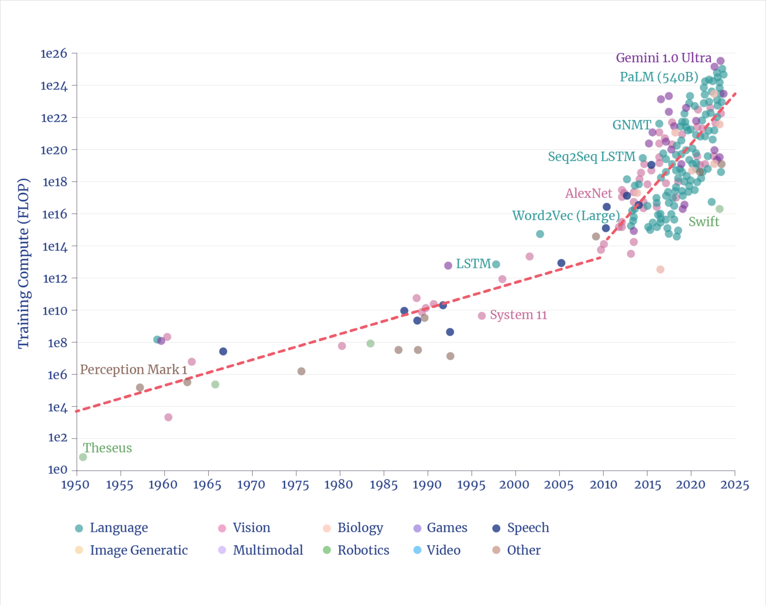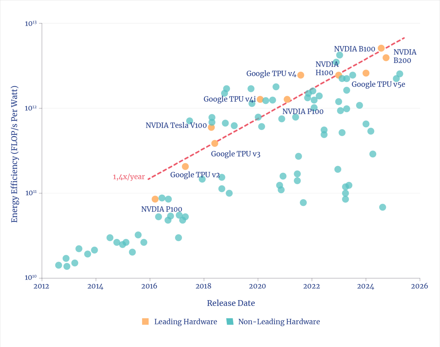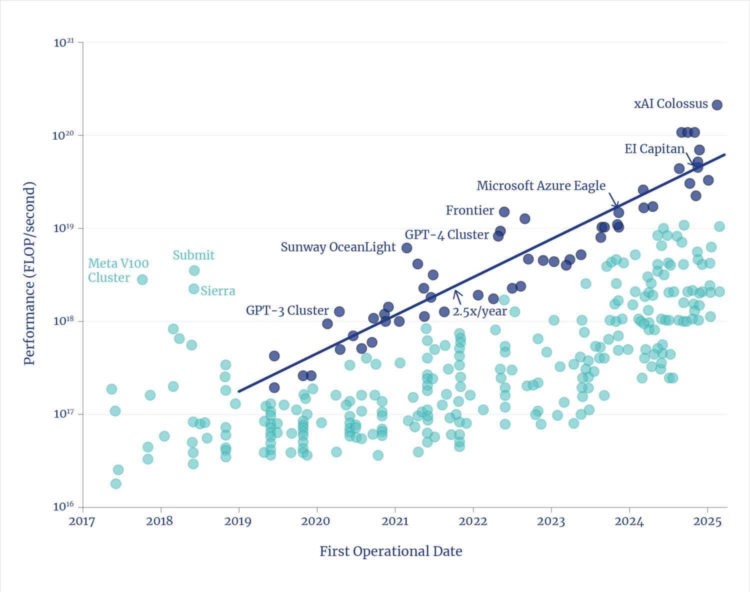 The rate of progress in the underlying AI compute capabilities follows a well-established, predictable trend of exponential gains.