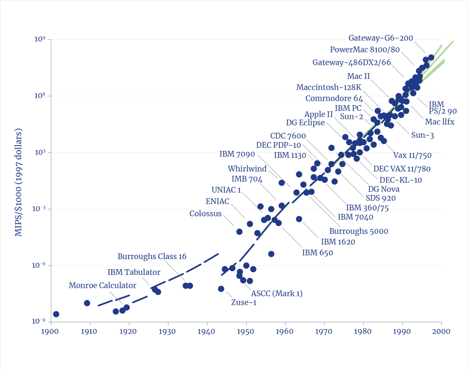 The origin of digital computers based on binary logic traces to 1937, with Claude Shannon’s seminal MIT master’s thesis, the Magna Carta of the digital age.3 Alan Turing, a colleague of Shannon, observed at the time that the Colossus computer (built during World War II, just before the U.S. Eniac) could perform tasks that would otherwise have taken, as Turing is said to have observed, “100 Britons working eight hours a day on desk calculators 100 years” to crack the German code.4 Some four decades would pass before the age of the PC would arrive because of the inexorable, exponential progress in compute power.