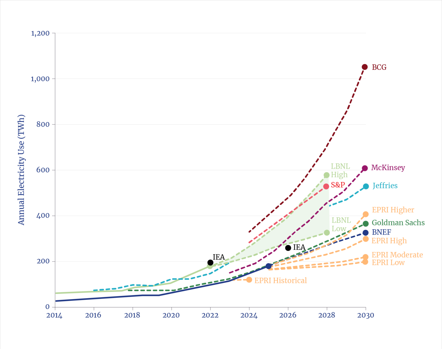 Policymakers, investors, and businesses in the AI supply chain are all interested in discerning just how much additional electricity will be needed specifically for powering data centers and how it will be supplied. For this analysis, we’ve reviewed dozens of different industry and technical reports to look for clues and consensus.