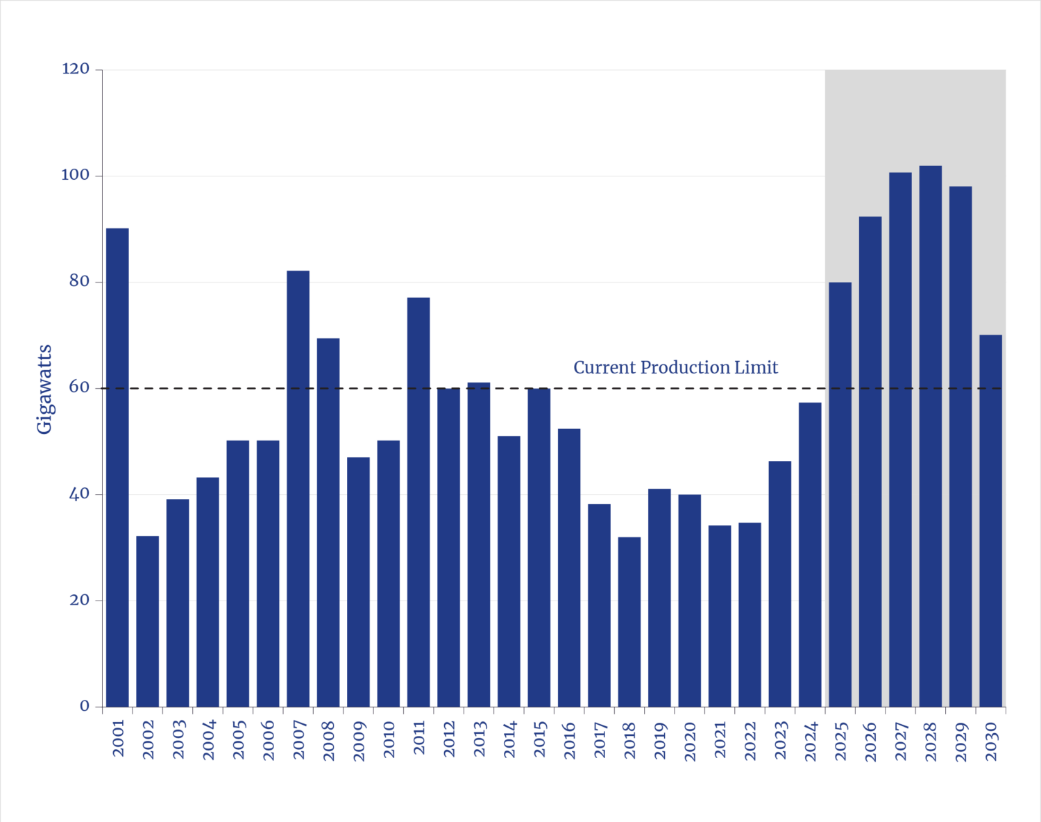 The likely pace of AI will require 75–100 GW of new electricity generating capacity to supply as much as 1,000 terawatt-hours a year more electricity for digital demands by the early 2030s.