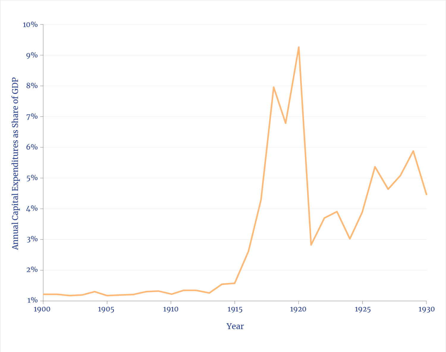 - https://www2.census.gov/library/publications/decennial/1920/bulletins/manufacturing/manufactures-us.pdfLowell. J. Chawner, “Capital Expenditures for Manufacturing Plant and Equipment—1915 to1940,” St. Louis Fed, Survey of Current Business, vol. 21, no. 3, March 1941:9–16; U.S. Department of Commerce, National Bureau of Economic Research, Macrohistory Database: New Manufacturing Capital Expenditures (Series Q10096USQ144NNBR), 1940; U.S. Bureau of the Census, Census of Manufactures: 1919 (2022); United States Bureau of the Census, Materials Used in Manufactures: 1929; U.S. Bureau of Mines, Petroleum Refinery Statistics: 1930, Bulletin 367, 1931; U.S. Bureau of the Census, Historical Statistics of the United States, 1789–1945, (1949); Engineering News-Record, Construction Cost Index History (1908–2005) (McGraw-Hill, 2005); U.S. Bureau of the Census, Census of Manufactures: 1939 (1942); Louis Johnston and Samuel H. Williamson, “What Was the U.S. GDP Then?” MeasuringWorth, 2025. We reconstructed annual U.S. spending on chemical, pharmaceutical, fertilizer, and petroleum refinery plant construction from 1900–1930, expressed in constant 1915 dollars as a share of GDP. Data were back cast to early Census benchmarks and the series was calibrated so that 1930 equaled about 4.4 % of GDP, consistent with the 1939 Census benchmark.