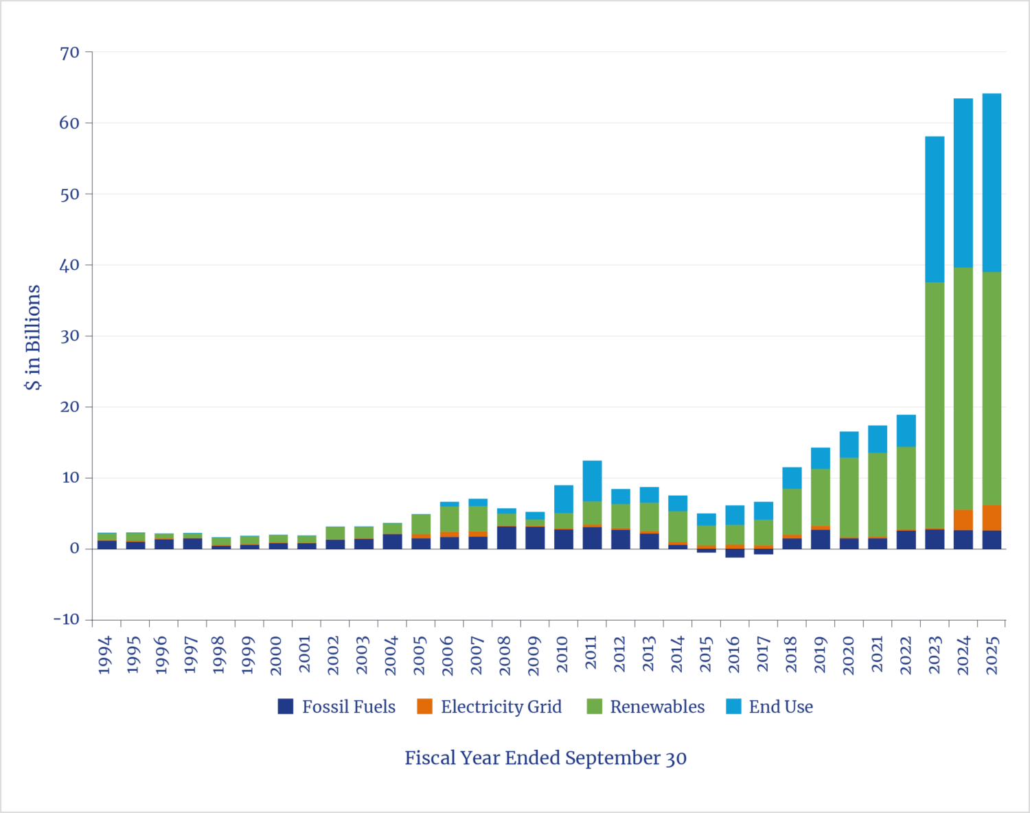 By way of comparison, figure 1 also breaks out the non–fossil fuel component of tax expenditures for the energy industry, highlighting the disproportionate share garnered by renewable developers and clean energy- and efficiency-related end-use projects over the past 10–15 years, particularly the step change in the wake of the IRA’s passage in 2022. In fiscal year 2025, tax expenditures for renewables and end users aggregated $57.9 billion.